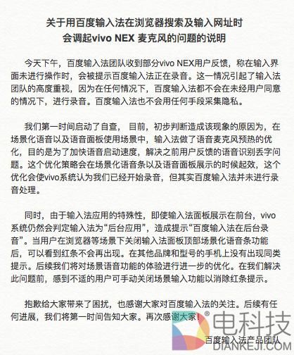 在QQ浏览器偷偷调用摄像头事件后,vivo NEX官方进行了系统升级,加入了对第三方应用调用摄像头、麦克风的提醒功能。之后有网友发现并爆料称,百度输入法在未唤醒语音输入时,存在偷偷录音的现象。百度对此回应显示输入法做了语音麦克风预热的优化,但目的是为了加快语音启动速度,解决用户反馈的语音识别丢字问题,并未进行录音处理。