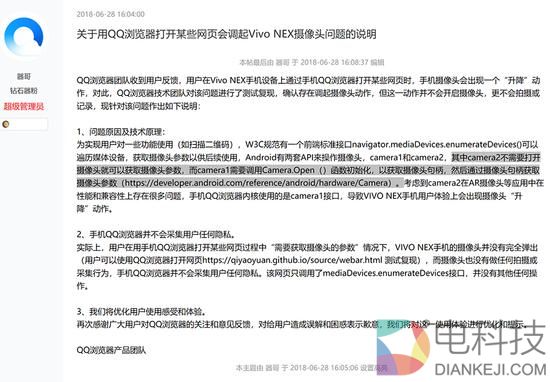 对此,6月28日,QQ浏览器团队作出回应称,安卓(Android)系统的设计规范有两套API来操作摄像头,第一种不需要打开摄像头就可以获取摄像头参数,第二种则需要调用Camera.Open()函数初始化,才能最终获取摄像头参数。考虑到第一种方案在AR摄像头等应用中存在性能和兼容性问题,手机QQ浏览器内核使用的是第二种方案,这种方案会让vivo NEX用户出现摄像头“自动升降”的情况。