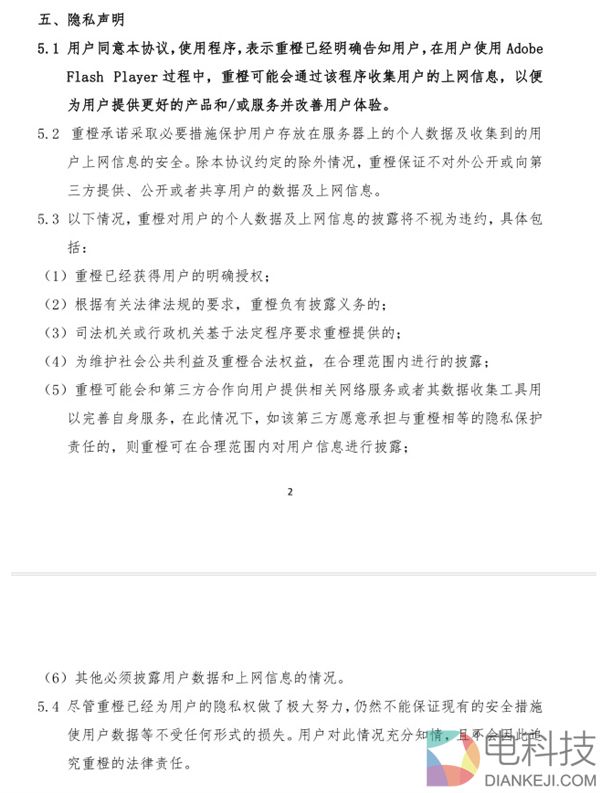 Adobe给出的用户协议里也明确写着,Flash Player使用过程中,重橙可能会搜集用户的上网信息,并强调已经获得用户明确授权,对用户个人数据和上网信息的披露不属于违约行为,甚至不能保证用户数据的损失。