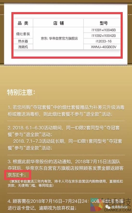 独角鲸科技注意到,活动期间在线上电商平台购买华帝“夺冠套餐”的顾客可获平台购物卡,而线下门店的退款方式五花八门,有退现金、银行转账、购物卡等形式,而各地经销商认可的活动时间也不尽相同。比如,购买京东“夺冠套餐”的消费者,可以获得同等价值的E卡,而非原路返还现金。
