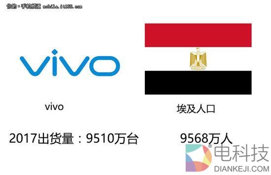 vivo在2017年的出货量达到了9510万台,vivo的出货量已经接近一个亿,估计2018年的出货量将会超过1个亿,而这个数字接近一个埃及的人口,2017年埃及总人口9568万人,如果一人一台vivo手机,还是勉强能平分的。