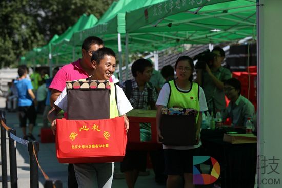 2013年8月31日,北京大学,一名大一新生在北大迎新"绿色通道"内领到了爱心礼包。视觉中国供图 视觉中国供图