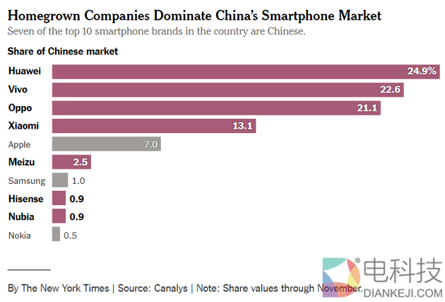 美国《纽约时报》近日发表文章称,苹果对中国市场iPhone销量低迷发出预警,但行业观察人士表示,iPhone销量低迷的幕后推手其实是中国品牌生产的设备。华为、小米、OPPO和vivo虽