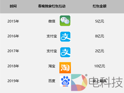 从2015年微信首度与春晚合作成为独家网络互动平台为大家发红包开始,之后的2016年至2018年三年间为全国人民造福祉的发红包活动就一直被阿里把持在手。2019年这发红包的工作则落在了2018年势头很猛的百度身上,依旧是春晚当夜(2月4日),四轮红包。这么一看,可谓是铁打的红包,流水的BAT。
