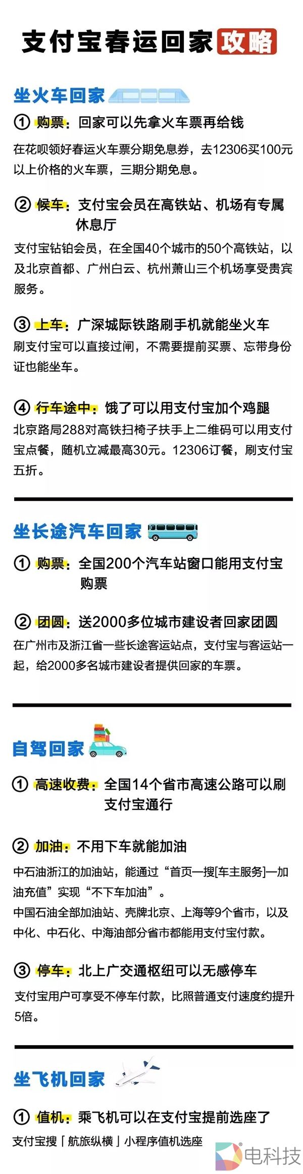 此外,支付宝官方还发布了一份春运回家攻略,坐火车、坐长途汽车、自驾、坐飞机都能用到支付宝: