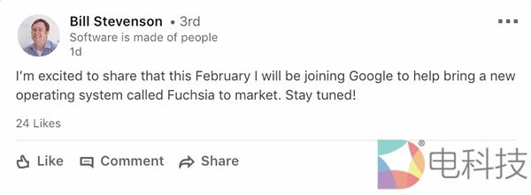 据外媒报道,谷歌已经聘请了有着14年经验的资深工程师Bill Stevenson来操盘Fuchsia,目标是推向成熟市场。看来,Android、Chrome OS要在Fuchsia OS时代被双双取代。