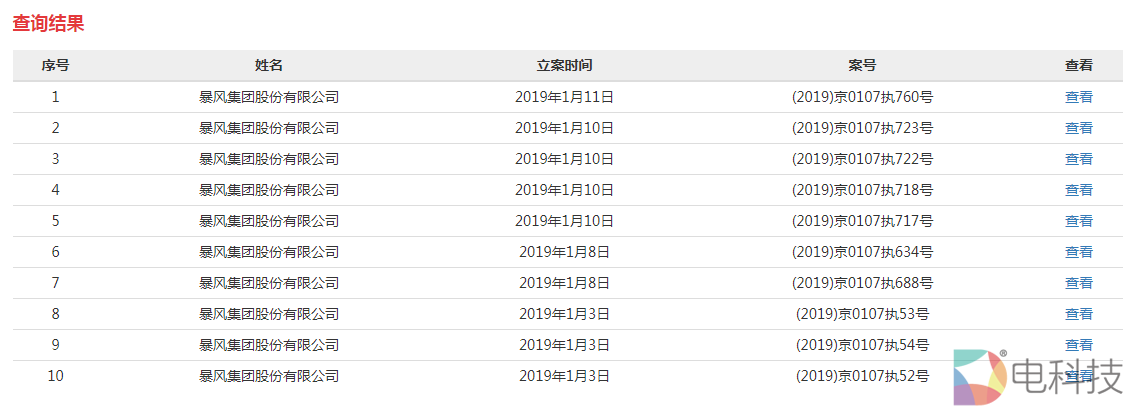 目前,暴风集团已经跌停,市值为26.39亿元。通过最高法院执行信息平台可以查询到,自2019年1月3日至1月11日,暴风集团已经增加了十几条被执行人信息。