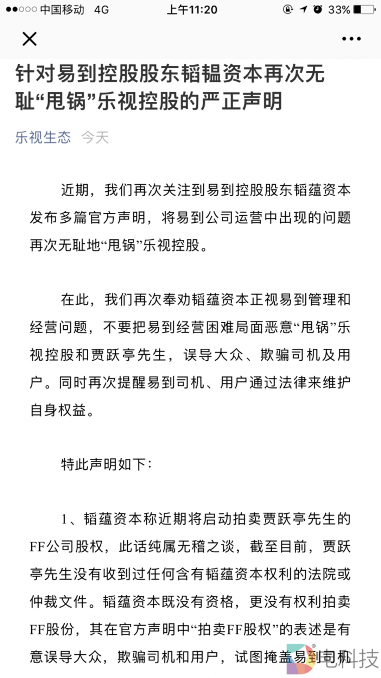 针对易到控股股东韬韫资本再次无耻“甩锅”乐视控股的严正声明