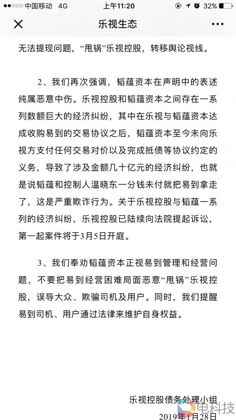2、我们再次强调,韬蕴资本在声明中的表述纯属恶意中伤。乐视控股和韬蕴资本之间存在一系列数额巨大的经济纠纷,其中在乐视与韬蕴资本达成收购易到的交易协议之后,韬蕴资本至今未向乐视方支付任何交易对价以及完成抵债等协议约定的义务,导致了涉及金额几十亿元的经济纠纷,也就是说韬蕴和控制人温晓东一分钱未付就把易到拿走了,这是严重欺诈行为。关于乐视控股与韬蕴一系列的经济纠纷,乐视控股已陆续向法院提起诉讼,第一起案件将于3月5日开庭。