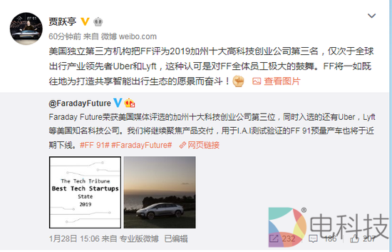 1月30日午间消息,时隔90天后,贾跃亭在其个人官方微博上发声,称美国独立第三方机构把FF评为2019加州十大高科技创业公司第三名,仅次于全球出行产业领先者Uber和Lyft,这种认可是对FF全体员工极大的鼓舞。FF将一如既往地为打造共享智能出行生态的愿景而奋斗!