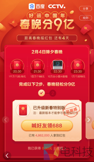 今年的春晚真可谓是群星闪耀,老少皆宜。电视机前的你,除了能享受这一视听盛宴外,还有远超往届的4轮大红包等你来分!第一轮红包总额3亿,含1000万个20.19元的红包;第二轮总额3个亿,含一百万个88元的红包;第三轮红包2亿,含10万个小度人工智能音响;第四轮:总额1亿,含一万个2019元的红包,金额大,奖励多,快快召唤亲朋好友下载百度App(新春特别版),坐等红包雨吧!
