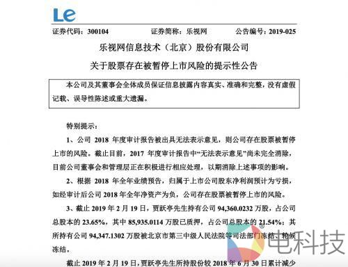 根据2018年全年业绩预告,乐视网预计,归属于上市公司股东净利润为亏损,如经审计后公司2018年全年净资产为负,公司存在股票被暂停上市的风险。