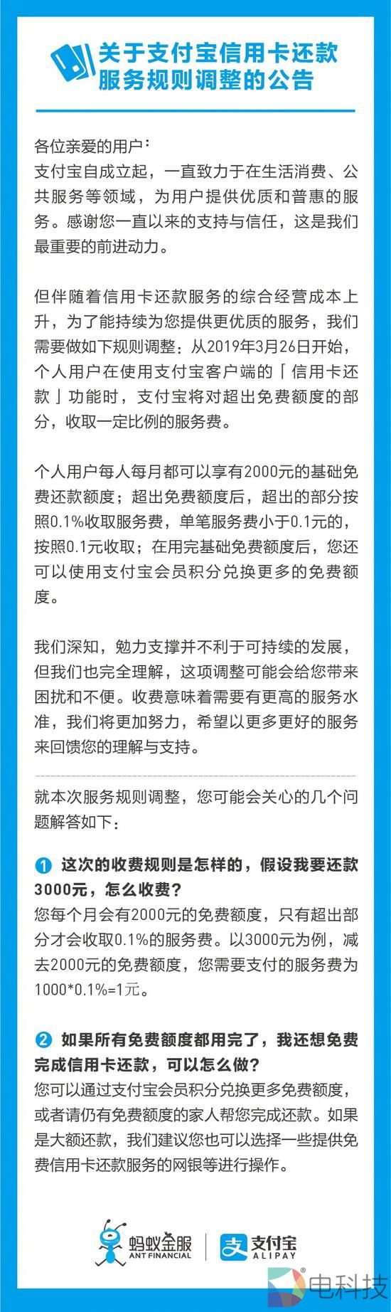 微信信用卡还款收费大半年之后,2月21日,支付宝对外发布公告表示,为了持续向用户提供更优质服务,自3月26日起,通过支付宝给信用卡还款将收取服务费。但是,每人每月2000元的免费额
