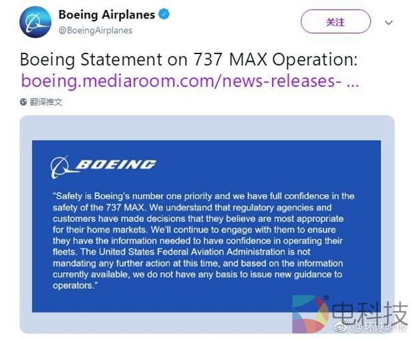 波音公司最新声明称:“安全是波音公司的首要任务,我们对737 MAX的安全性充满信心。我们了解监管机构和客户已做出他们认为最适合其本土市场的决策。我们将继续与他们保持沟通,以确保他们拥有对运营机队充满信心所需的信息。美国联邦航空管理局此时并未强制要求采取任何进一步行动,并且根据现有信息,我们没有任何依据向运营商发布新的指南。”