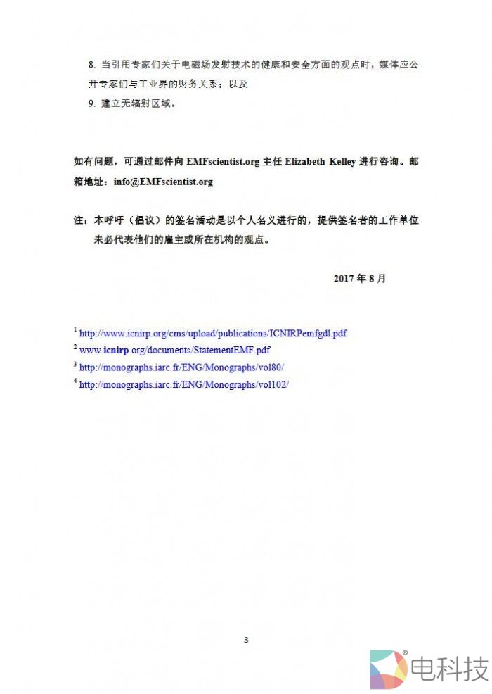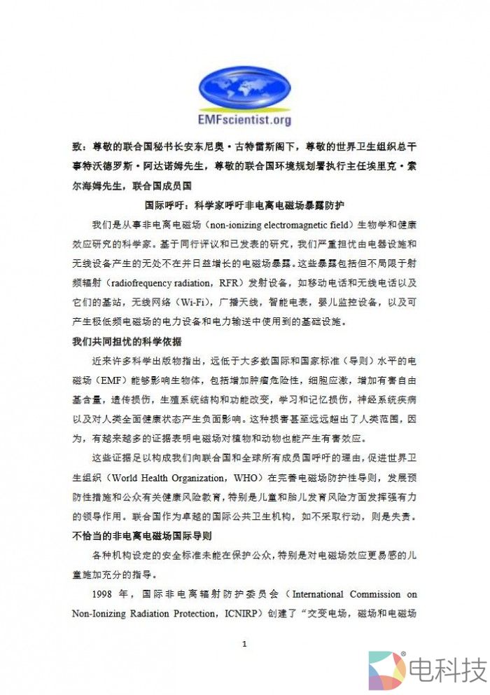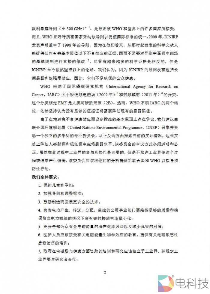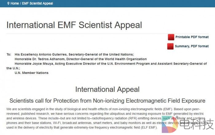在请愿书中写道:近期国际癌症研究机构的诸多研究结果表明EMF会增加“致癌”风险。EMF是是一种类似于X光或者紫外线的无线电波,但是没有后者那么强大和危险。在高强度EMF辐射下,会导致灼伤并影响人体细胞的生长。但是目前对于低强度的EMF对人体的影响目前并没有确切的结论。