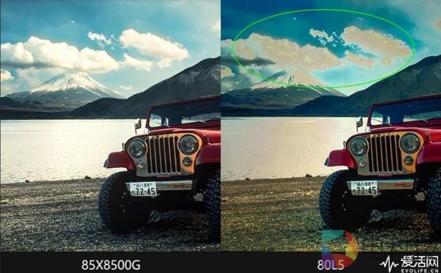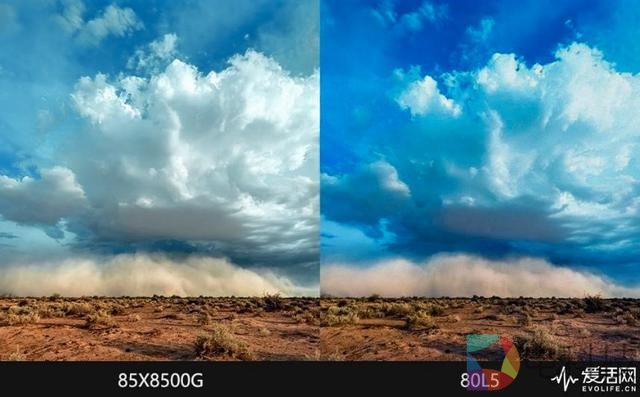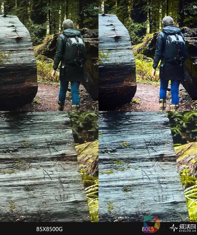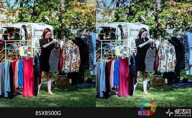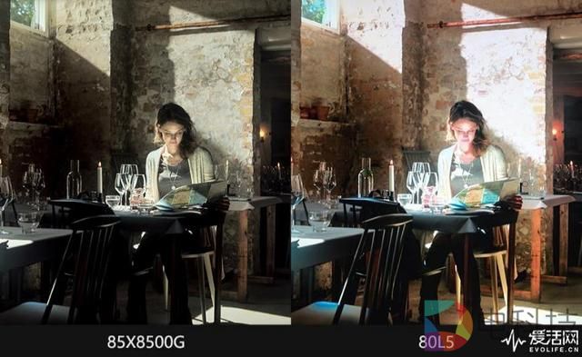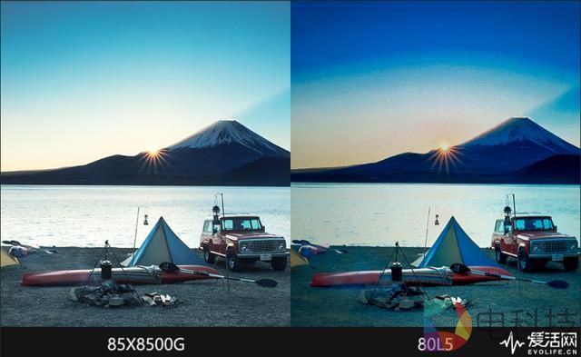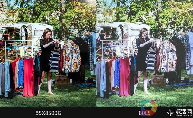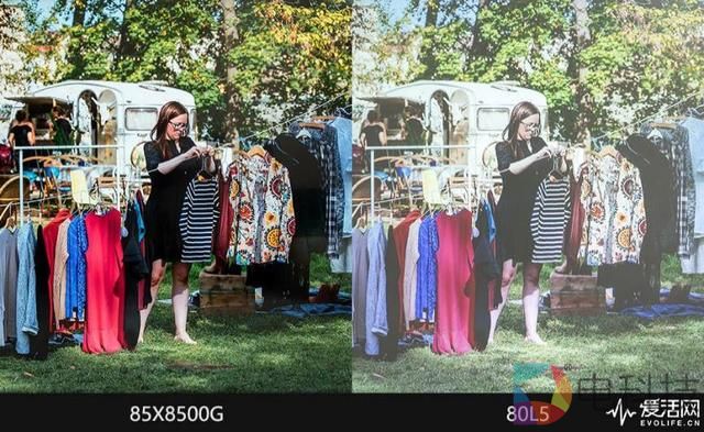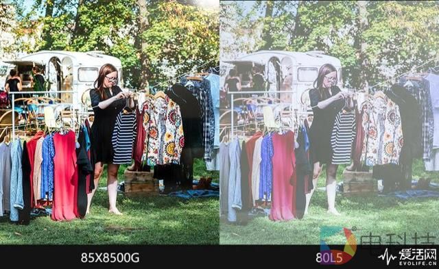 从整体风格上看,85X8500G色彩风格比较接近真实,80L5的色彩风格则倾向洋红色,饱和度极高。这些只是表面上不同,80L5使用了一种非常激进的色彩处理方式,相近色之间缺少过渡,再加上高饱和度,高光细节丢失,看起来非常不舒服;85X8500G色准更为准确,还原出场景、物体的颜色。