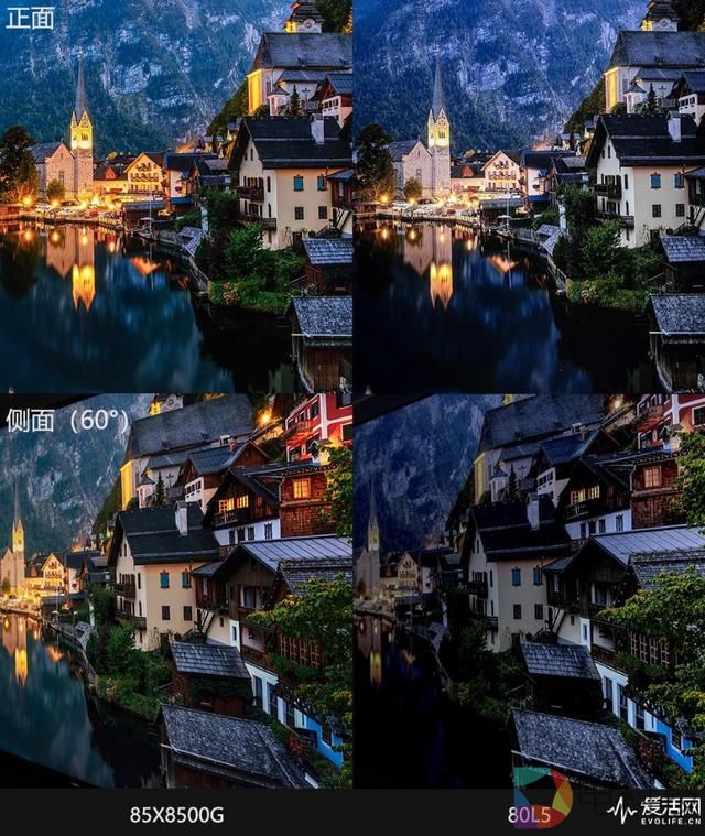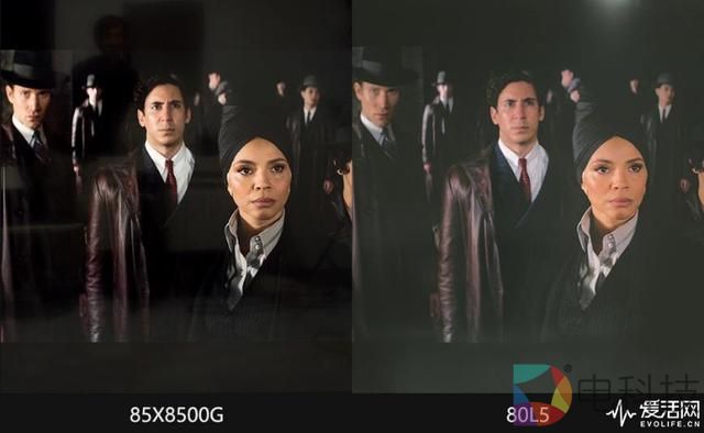 在播放图片时(图像模式为"标准"),正面上看85X8500G、80L5亮度相当接近,可随着视角增加,80L5亮度会急剧下降,在回放暗调图像会觉得画面黑漆漆一遍