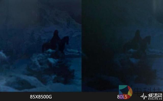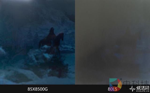 在播放暗调视频时,比如说以黑著称的《权利的游戏》第八季第三集时,85X8500G依靠着较高的亮度重现了不少画面暗部细节。80L5受限于亮度,重现画面暗部细节非常吃力,难以看清背景里细节。