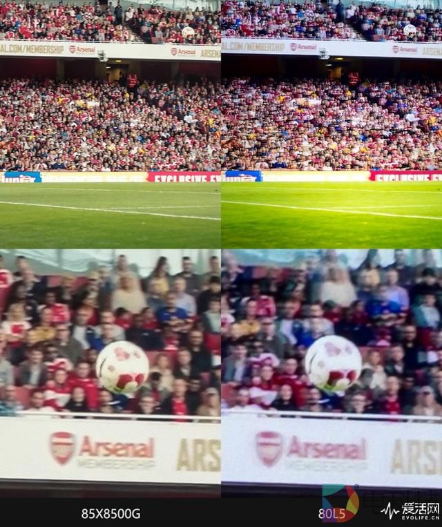 比较出乎意料的是,在表现球类运动时80L5没有展示出DLP的优势,相比较来看,80L5无论是远处的观众席,还是下方的足球特写,"Arsenal"字样,都出现了一定程度的拖影,画面有些糊。