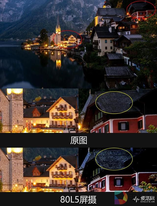 然而决定一台激光电视实际分辨率的不只是芯片,还有镜头。接下来看一组静态照片屏摄对比(图像模式为"标准"),会发现80L5画面边缘存在明显的像散,瓦片变得模糊不清,80L5理论上是一台4K电视,实际分辨率却低于4K。