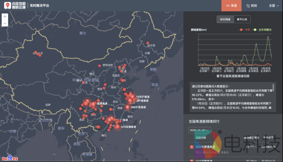 具体而言,高速拥堵趋势及拥堵路段展示功能,可为用户展示今日全国、各省份、各城市的高速拥堵变化趋势,并展示当前全国前10名最拥堵的高速路段,包含拥堵路段名称、拥堵里程及平均速度等信息,有利于公众提前了解道路通行情况,规划出行时间和路线。同时,该功能还支持查询春节以来全国100+城市的高速拥堵变化趋势,并展示整个春节期间的高速拥堵路段排行榜,可与去年同期作对比,为政府及交通运输单位提供了客观全面的大数据参考,便于对高速路的异常情况进行疏导与治理。