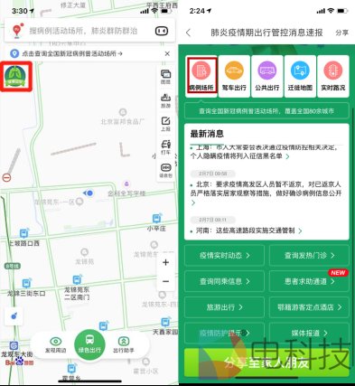 同时,百度地图还提供了聚合多种出行信息的“肺炎疫情期出行管控消息速报”。在速报中,也可查看“新冠病例曾活动场所”专题地图。