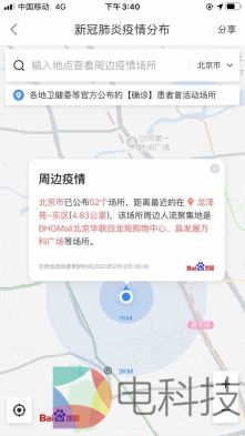 同时,用户在进入疫情小区地图后,还可以通过页面上方的检索框,输入用户关注地点名称,搜索结果也将呈现该地点的“周边疫情卡”,并在地图中对疫情小区进行标注,方便用户更直观地了解搜索地区周边的疫情情况。而当用户点击搜索栏右侧城市按钮选择其他城市并切换后,便可查看目标城市的新冠肺炎疫情分布情况。