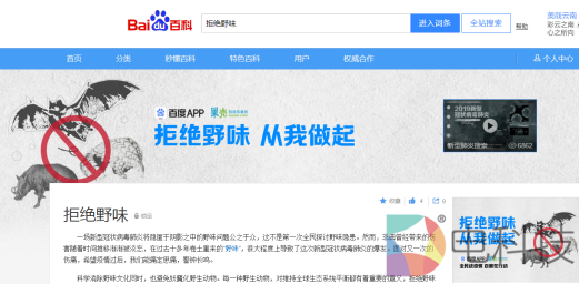 除了搜索页特效彩蛋,百度百科还上线了“拒绝野味”词条,对“野味”进行有效的科普,让“拒绝野味”成为基本常识的同时,也避免让野生动物妖魔化。