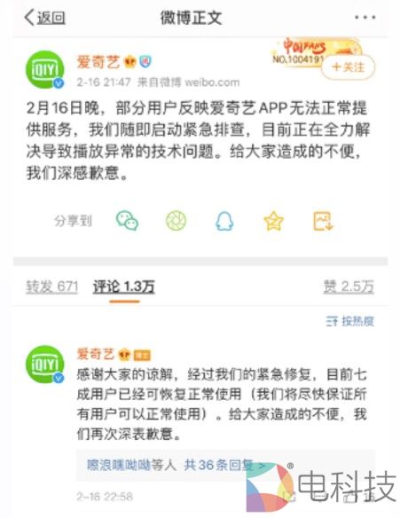爱奇艺官方微博发布声明:2月16日晚,部分用户反映爱奇艺APP无法正常提供服务,我们随即启动紧急排查,目前正在全力解决导致播放异常的技术问题。给大家造成的不便,我们深感歉意。后续爱奇艺官方微博再次同步解决进展,经过紧急修复,目前七成用户已恢复正常使用。