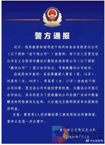 2020年下半年才第一天,2020年度新闻已经出现了有力竞争者——日前,腾讯状告老干妈拖欠广告费,老干妈回应腾讯遭遇诈骗。7月1日,贵阳公安双龙分局通报了该事件调查结果:3人伪造老干妈公司印章,冒充该公司市场经营部经理与腾讯签订合作协议,目前3人已被刑拘。