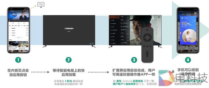 以直播应用为例,用户在手机端点击“扩展屏”按钮把应用“投”到大屏后,可以用大屏的遥控器进行换台等操作,这是传统投屏做不到的。同时也可以反向回来,用户在大屏端操作可以反向推到手机上。比如传统的购物扫码,如果用扩展屏就会很方便,用户无需扫码,手机上直接付款。