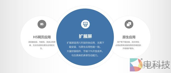 原生应用是安卓系统标准的应用,效率最高,但它最大的麻烦是需要下载、安装。如果某个应用你点它下载、安装,再打开,这个效率会非常低,流程很容易中断,而且还要做升级、适配。后来有的厂家就用H5来做,H5很轻量,但是它的运行效率低,资源占用率很高。我们也尝试过,有的原生应用的功能它是很难实现的。扩展屏是电视端的快应用,则不需要下载安装过程,性能跟原生应用一致,封装大量组件,节省70%的开发部署成本,非常方便使用,这已经是一个成熟的技术。