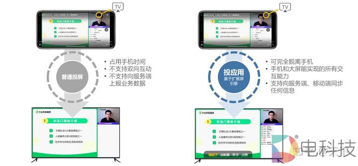 我们以网络教育中的直播课来举例。传统投屏状态下,小朋友只能看,做不了互动。手机(屏幕镜像)一直在消耗流量和电量,家长做不了别的事,微信什么的都用不了。 投应用操作方式类似投屏,但是它投过去以后,手机就可以干其他的事了。这个时候电视端的摇控器就可以用上了,小朋友可以通过摇控器点击反馈是否听懂了。老师可以让同学们选择ABCD,这是传统投屏方式做不到的,这是他们之间最大的区别。