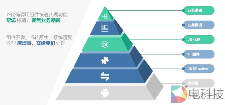 基于我们团队在OTT端十几年的经验积累,经过一年多的研发,终于实现了扩展屏引擎的产品化。这是我们的一个系统分层图。核心工作是连接,用JS代码调用系统UI组件快速实现功能,帮您将精力聚焦到业务逻辑。为了方便大家开发,我们上面又包了一层就是业务的模板。电视端的UI其实都差不多,点播类、直播类等等,大同小异。所以我们做了70多个组件模板,这样的话开发人员只需要关注到最尖上的业务核心代码。
