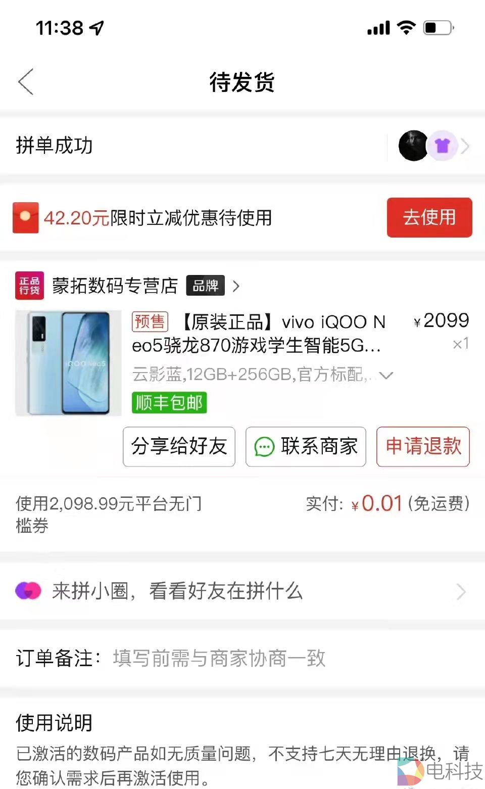 同时,砍价成功的页面显示,他获得了一张无门槛商品券,需要支付0.01元才能购买这款手机。“在直播间里的两个小时,一直显示都是砍价不成功。我好奇的是,现在究竟是我自己砍价成功了,还是拼多多官方关注到了此事,刻意‘送’了我一台手机?