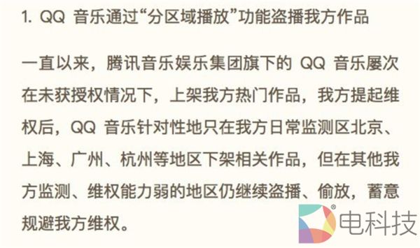 根据网易云音乐的说法,腾讯音乐娱乐集团旗下的QQ音乐屡次在未获授权的情况下上架其热门作品,并且在被维权后,也只在北京、上海、广州、杭州这些地区下架相关作品,但在其他地区仍然播放。
