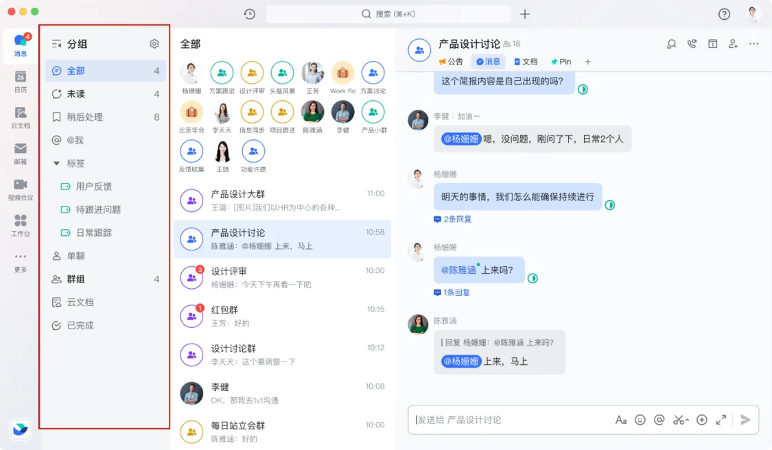 为进一步提升个人的信息处理效率,让重度用户可以从爆炸的信息中过滤出“有效信息”与“紧急信息”。飞书推出了“分组”功能——消息太多时,可支持用户手动或自动添加分组,按“@我”、“未读”、“单聊”、“云文档”等类别整理会话。