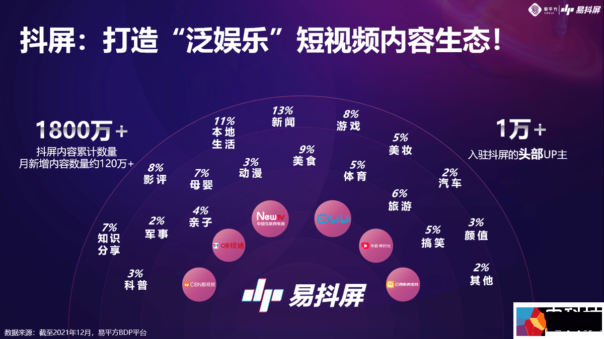易抖屏收纳了众多MCN机构和头部达人博主的优质内容,不仅涵盖新闻、美食、影评、母婴等垂直类栏目,还能满足多用户多场景差异化内容的需求,从根本上解决了大屏长视频栏目短板。根据易平方BDP平台数据显示,目前“易抖屏”内容节目数超1800万,月新增内容数量超120万,入驻的头部达人博主主超1万。