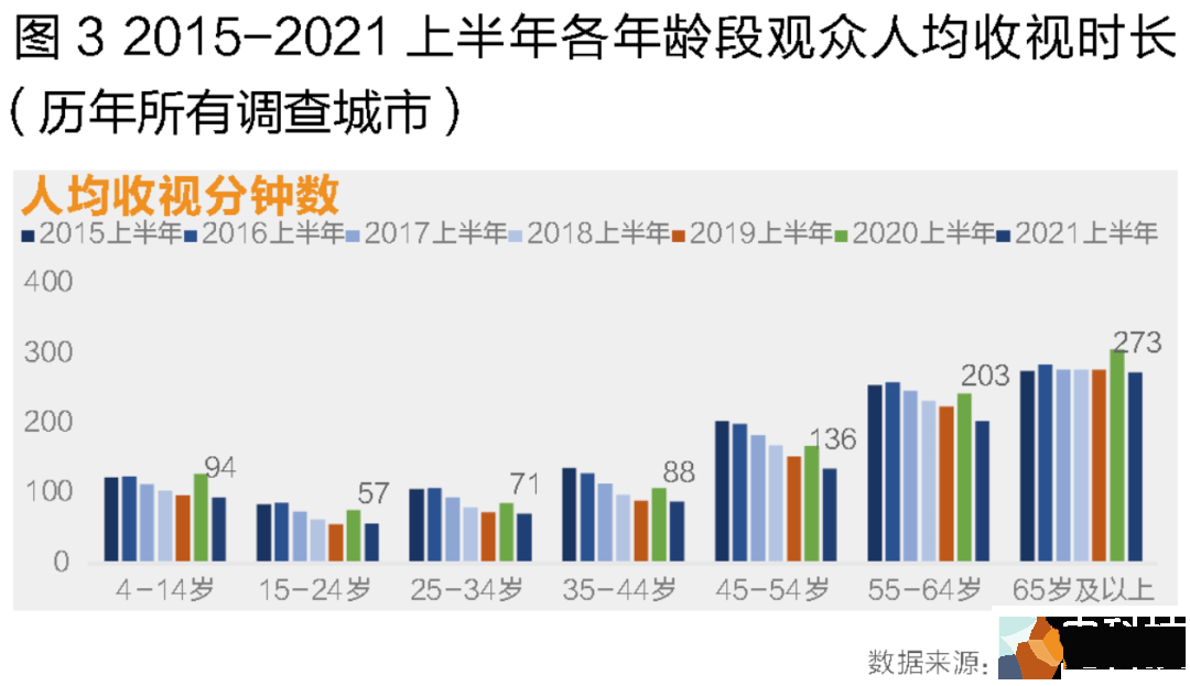 CSM媒介研究数据显示,在经历过2020年特殊时期的电视收视量普遍上涨之后,2021年上半年各年龄层收视时间出现不同层次回落,其中45~54岁和55~64岁中老年观众的下降幅度最大,分别减少了17分钟和21分钟。而 15~24岁青年观众人均收视时长57分钟,是唯一一组同比出现正增长的观众。