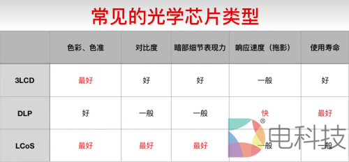 其中镜头,我们很好理解,代表着不同的焦段。而光阀也就是显示芯片,目前对常见的有5种,LCD、3LCD、DLP、3DLP、LCoS。过多的专业解释就不占篇幅了,直接说结论。