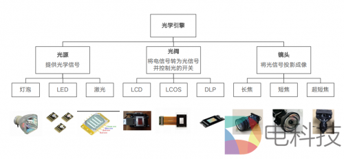光机,也就是下图的光学引擎,是投影仪最为核心的元器件。它的主要作用,就是通过光源提供光学信号,在经过光阀把电信号转为光信号,最终由不同的镜头决定投射成像的焦段。