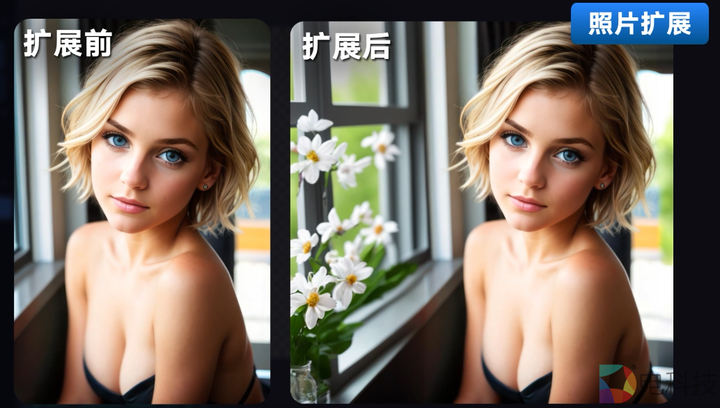 除此之外,海艺AI还拥有独特的“智能补图”功能,使用者只需拖入图片,就能在同一张图片的边界延伸空白,并利用 AI绘图生成图片内容,同时还能针对填入文字指令对新的区域进行补充。