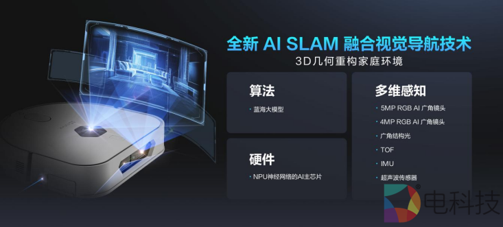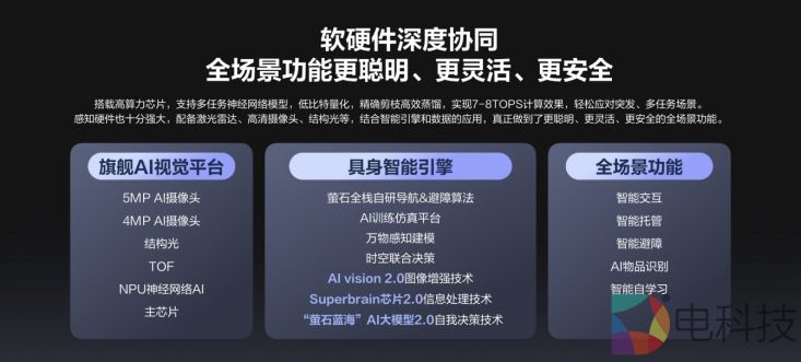 众所周知,AI最重要的三大要素是数据、算法、算力。作为智能家居领域的持续创新者,萤石始终重视AI技术投入和研发。RX30 MAX采用了AI SLAM融合视觉导航技术,搭载萤石自研的蓝海大模型,可以获得领先的数据和算法。而NPU神经网络的AI主芯片能够带来等效7~8tops算力,单机算力值对比上代提升了50%。数据、算法、算力的综合提升,大大提高了AI洗地机器人的智能水平。