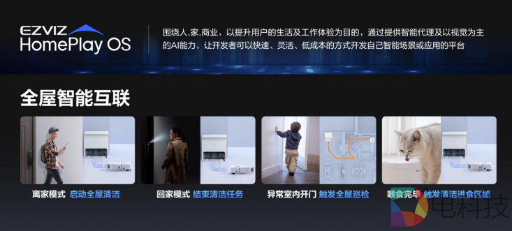 AI洗地机器人也支持与EZVIZ HomePlay OS联动,例如与门锁联动,离家模式触发全屋清洁,回家模式触发停止清洁,默默干活不打扰;当摄像头检测到室内异常时,机器人触发全屋自动巡检,守护家庭安全;当摄像头检测到宠物进食结束,触发对宠物喂食区进行清洁。省心、贴心、全能的智能管家,让用户真正解放双手,实现家务自由,净享自在生活。