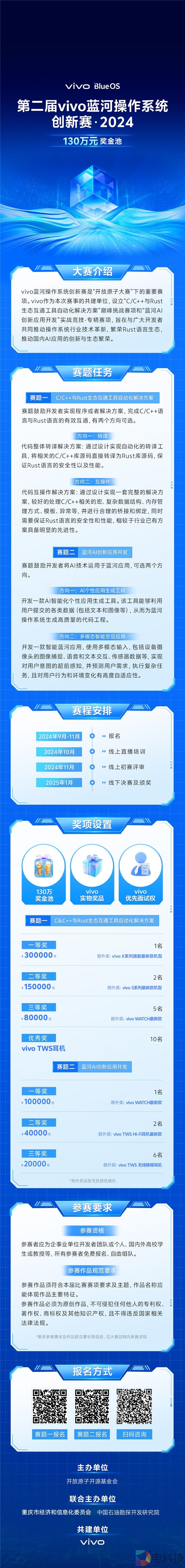 赛事方面,“C/C++与Rust生态互通工具自动化解决方案”赛题设置一等奖1名,奖金30万元;二等奖2名,奖金各15万元;三等奖5名,奖金各8万元;优秀奖10名,奖品为vivo TWS耳机。“蓝河AI创新应用开发”赛题设置一等奖1名,奖金10万元;二等奖2名,奖金各4万元;三等奖6名,奖金各2万元。两道赛题的总奖金池额度高达130万元,设置获奖人数均较上届比赛大幅增加,并且所有获奖队伍均可获得vivo实物奖品和优先面试权。