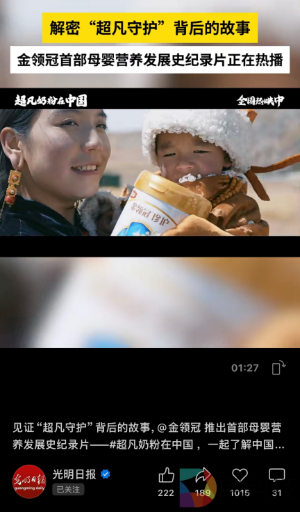 近日,金领冠重磅推出首部母婴营养发展史纪录片《超凡奶粉在中国》,讲述金领冠依托于伊利集团22年科研深耕,以母乳研究成果为基石,将中国母婴营养推向新高度的发展历程。该纪录片一经推出,就获得人民日报、光明日报、新华网等权威央、党媒的高度关注和点赞。