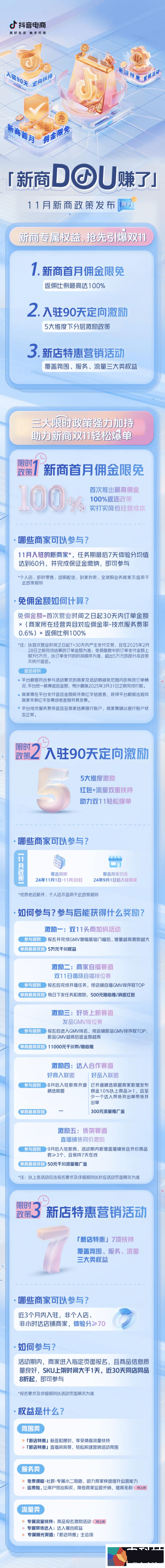 10月30日,抖音电商针对新商扶持发布专属IP"新商DOU赚了",并发布11月三大限时政策"新商首月佣金限免"、"入驻90天定向激励"和"新店