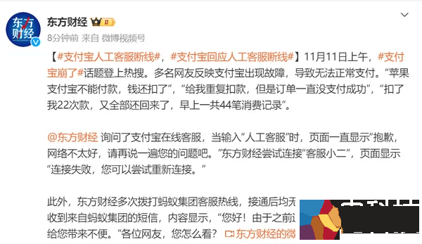 在数字化支付时代,支付宝作为中国最大的移动支付平台之一,其稳定性直接关系到数亿用户的日常生活和经济活动。然而,在双十一当天,支付宝突然出现服务异常,导致大量用户无法正常使用支付功能,“支付宝崩了”话题瞬间登上热搜。