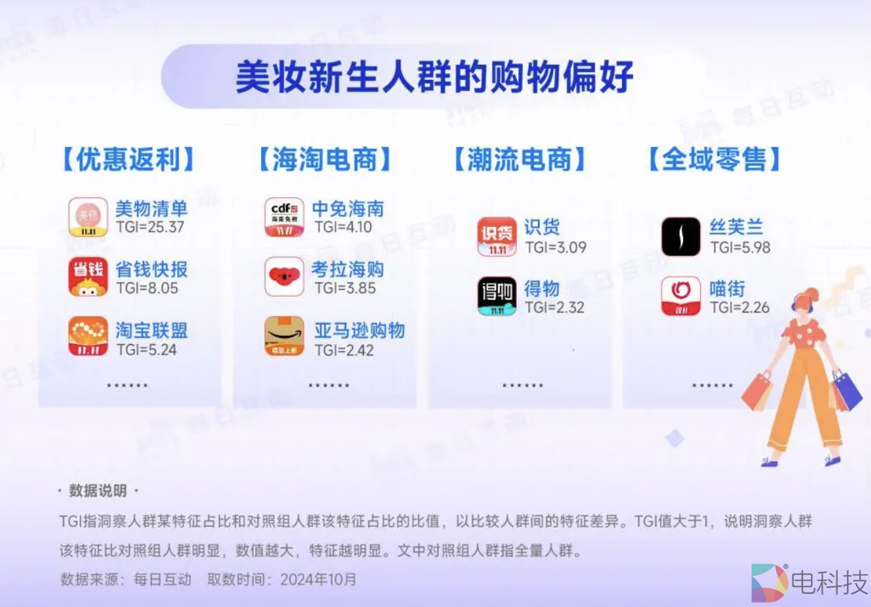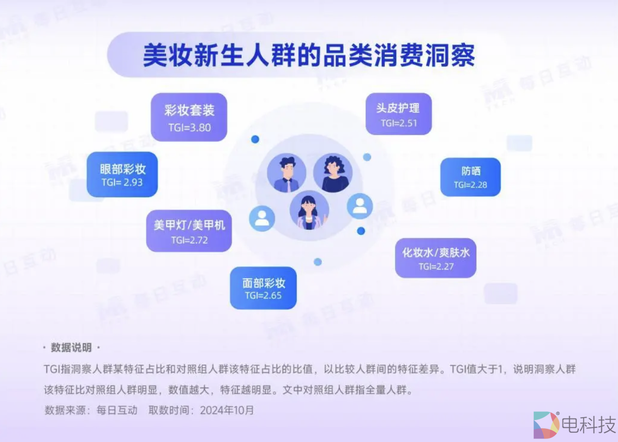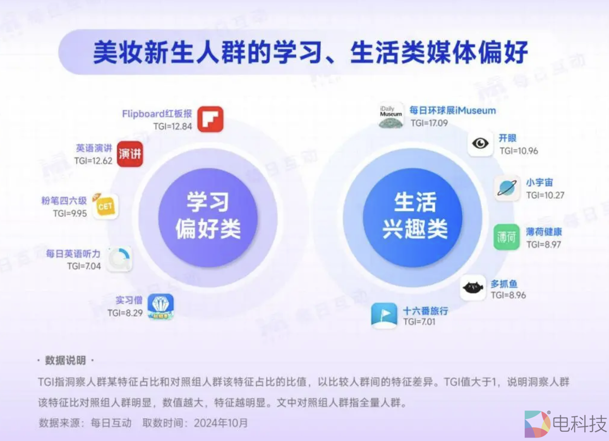每日互动大数据洞察发现,美妆新生们不仅热衷买买买(购物TGI=38.85),Z世代的TA们也热爱游戏(TGI=13.09),同时也不落下教育学习(TGI=7.75)。