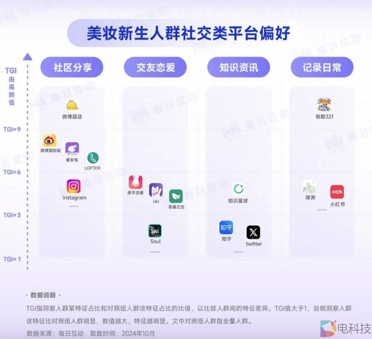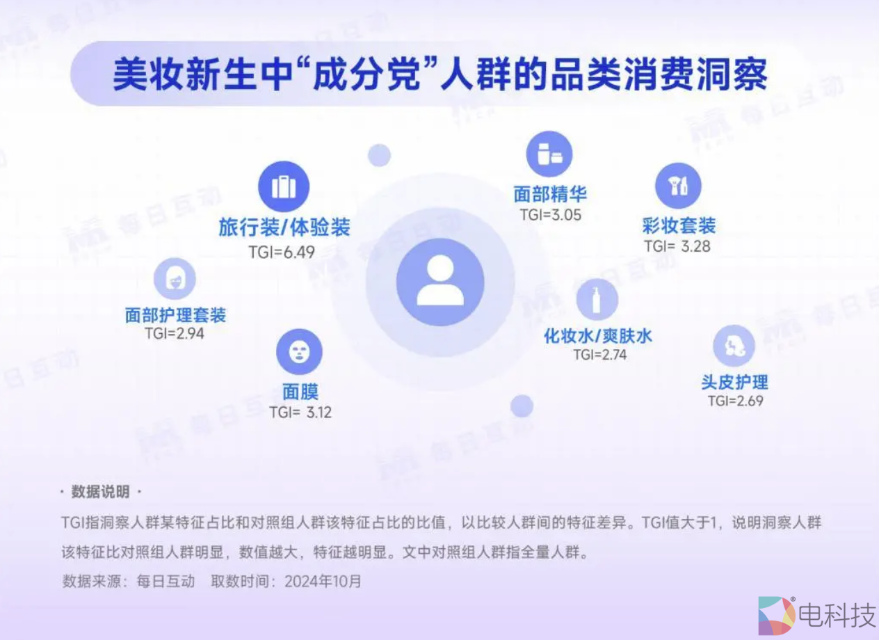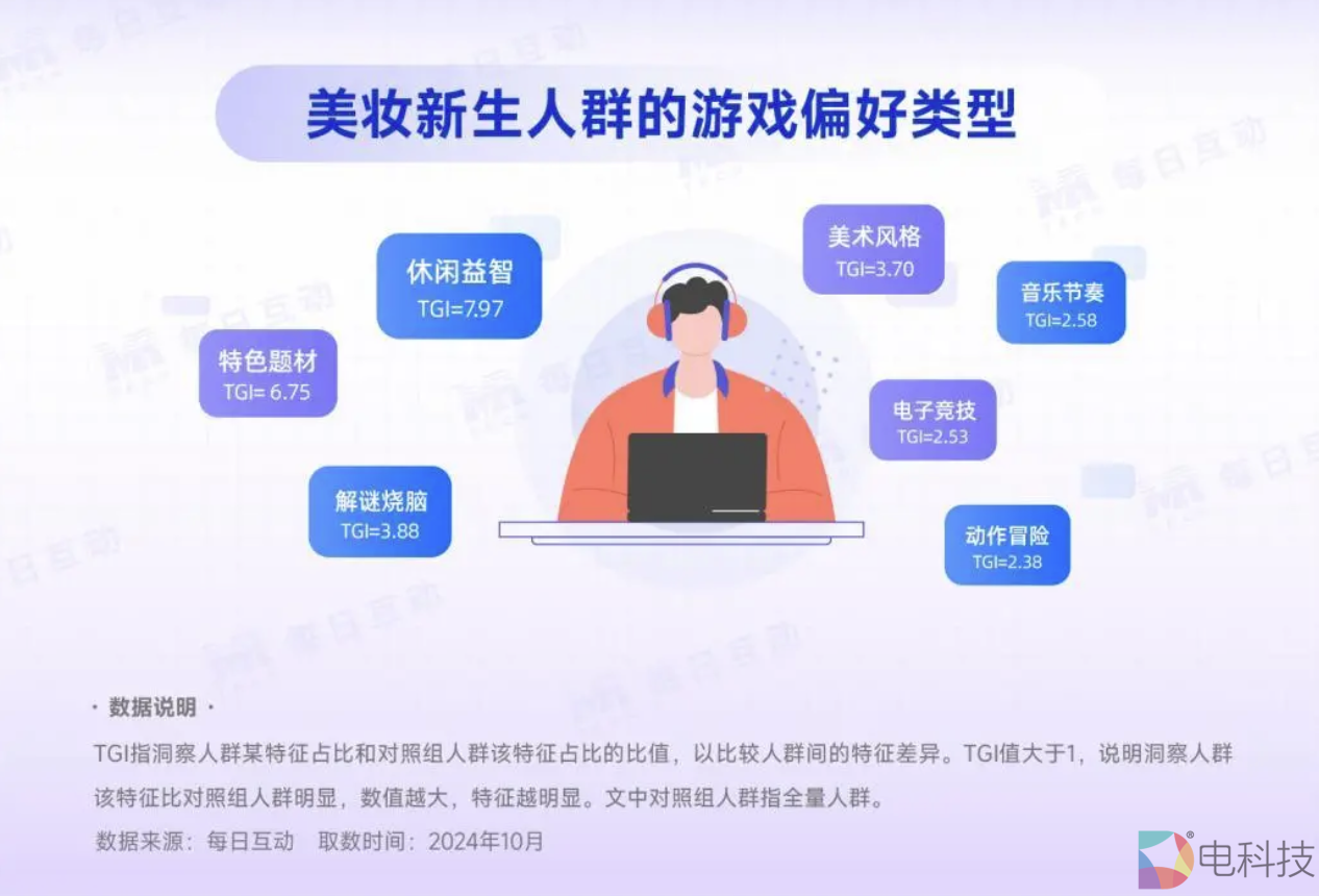 每日互动大数据洞察发现,美妆新生们不仅热衷买买买(购物TGI=38.85),Z世代的TA们也热爱游戏(TGI=13.09),同时也不落下教育学习(TGI=7.75)。